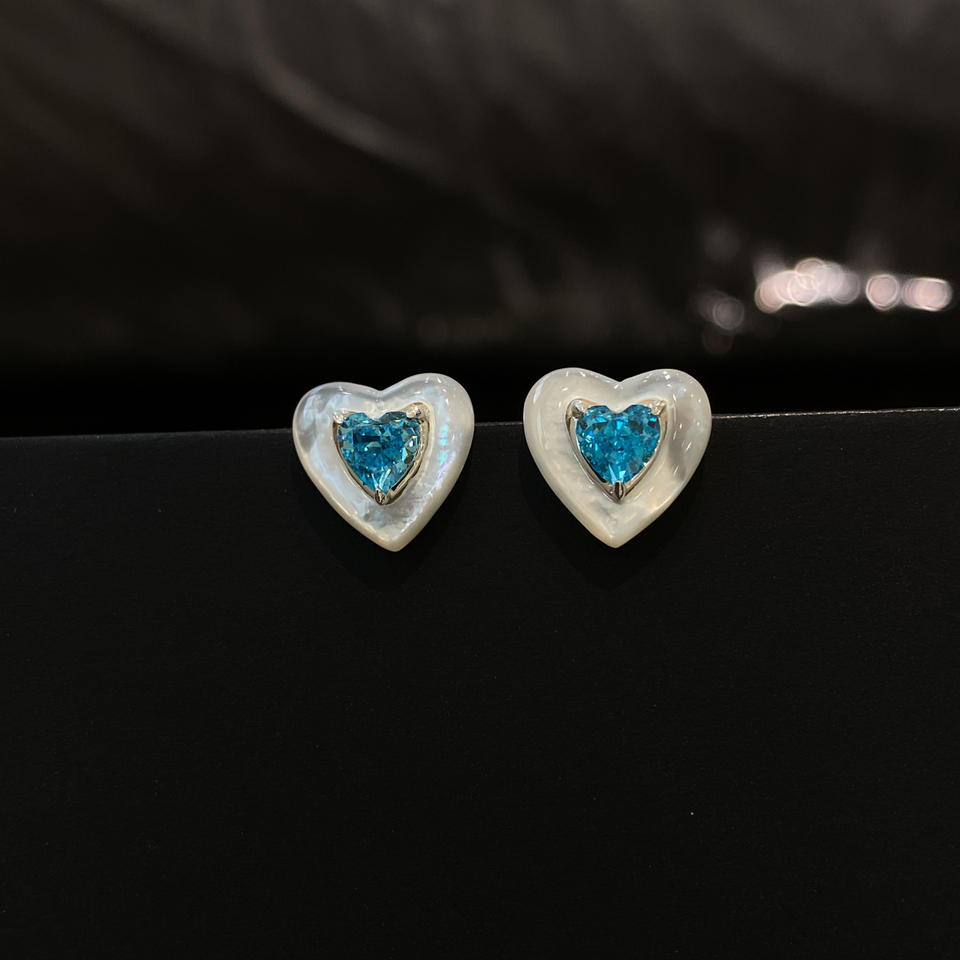 ต่างหูเงินแท้ S925 สไตล์เรโทรหรูหรา สีฟ้าทะเล รูปหัวใจ ประดับเปลือกหอยสีขาว ดีไซน์เฉพาะระดับไฮเอนด์ คริสตัล