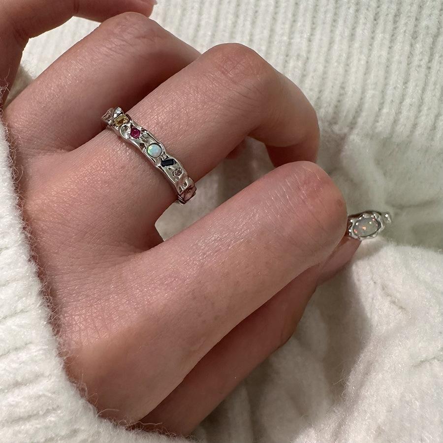 แหวนเงินแท้ S925 ประดับโอปอล พร้อมเพชรแตกเล็กๆ และดีไซน์เฉพาะตัว ฝังแบบอินเลย์ สไตล์หวานเท่