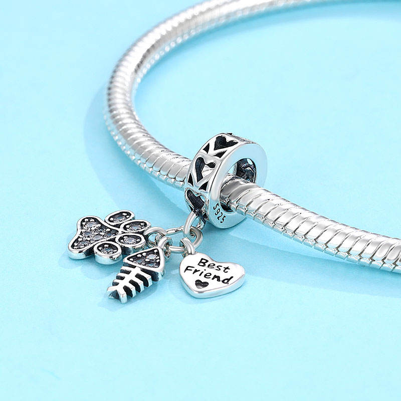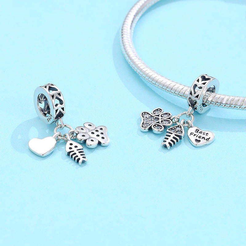 จี้รูปแมวเพื่อนซี้เงินแท้ S925 ประดับเพชร CZ รูปอุ้งเท้า กระดูกปลา หัวใจ แบบสามชิ้นห้อยประดับ