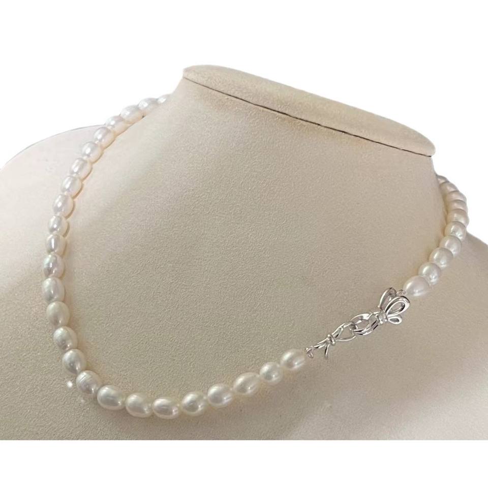 สร้อยคอไข่มุกน้ำจืดทรงข้าว 6 มม. พร้อมตัวล็อคเงินแท้ S925 คุณภาพดี สะอาดเรียบเนียน สายสร้อยคอสีทองเงิน