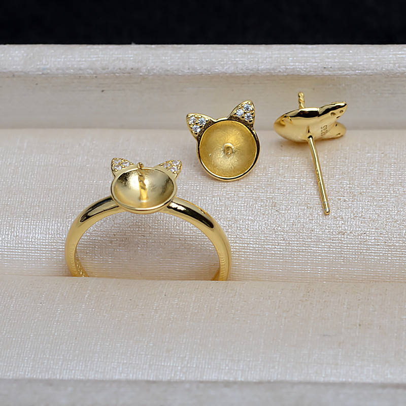 ชุดเครื่องประดับเงินแท้ S925 ประกอบด้วยจี้รูปแมว ต่างหูแบบห่วง แหวน ประดับมุก 8-9 มม. สำหรับผู้หญิง พร้อมอุปกรณ์ทำเครื่องประดับ