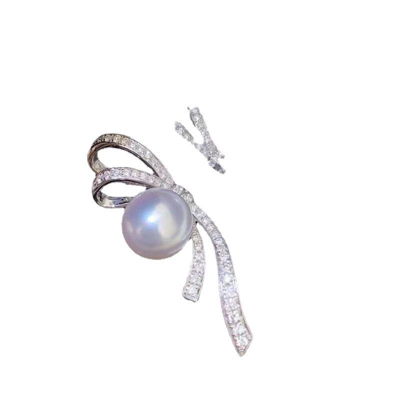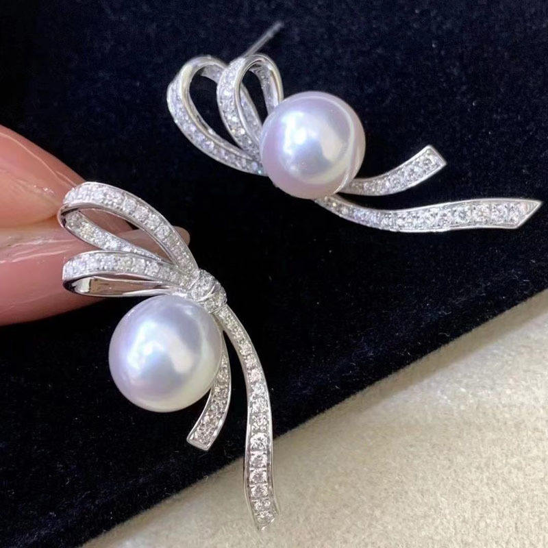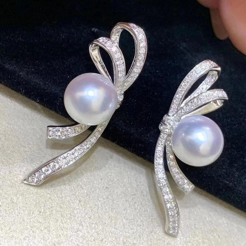 ตัวเรือนเงินแท้ S925 สำหรับทำเครื่องประดับมุก DIY พร้อมฐานและโบว์สำหรับลูกปัดกลมขนาด 7-9 มม. รุ่น 20859 ต่างหูเพชร