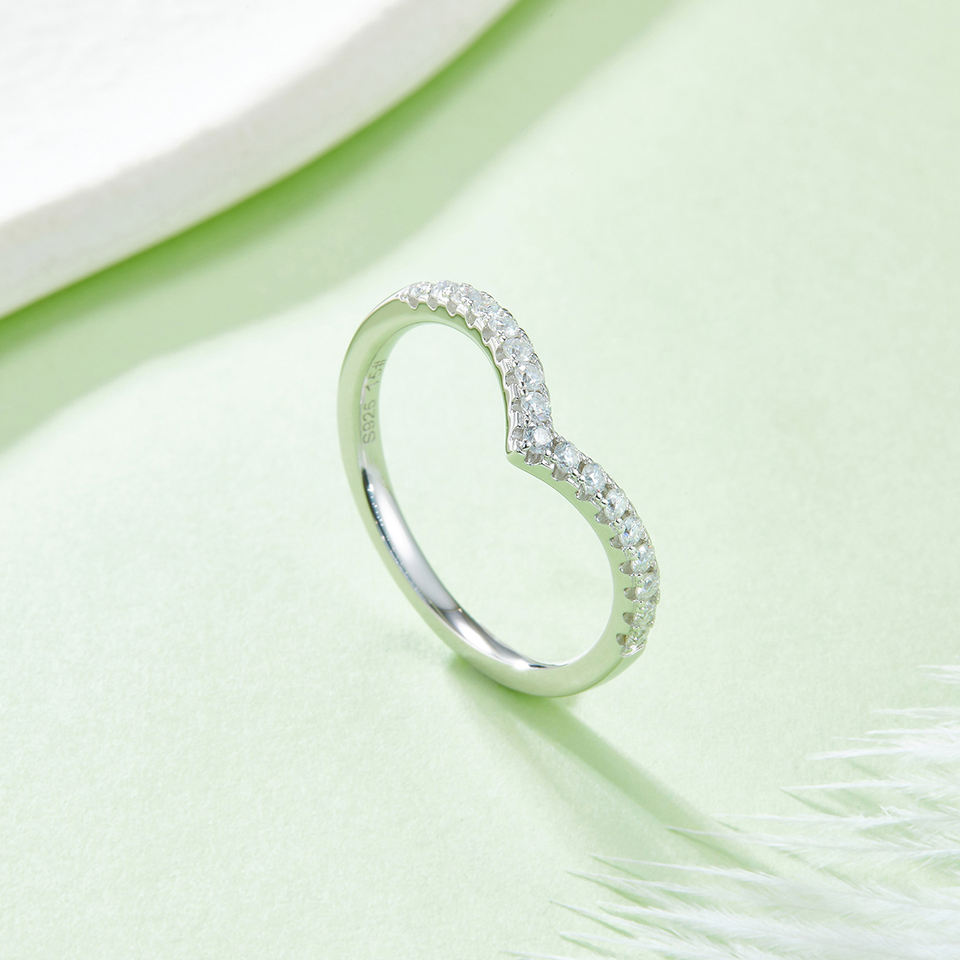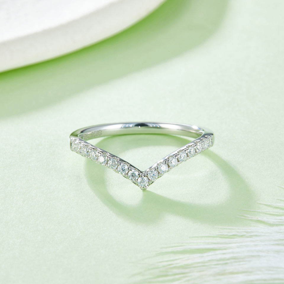 แหวนเงินแท้ S925 ชุบแพลตตินัม ทรงวี ประดับด้วยมอยส์ซาไนต์ทรงกลมเจียระไนแบบบริลเลียนท์ เกรด D 33 ตัวเรือนแบบกรงเล็บ