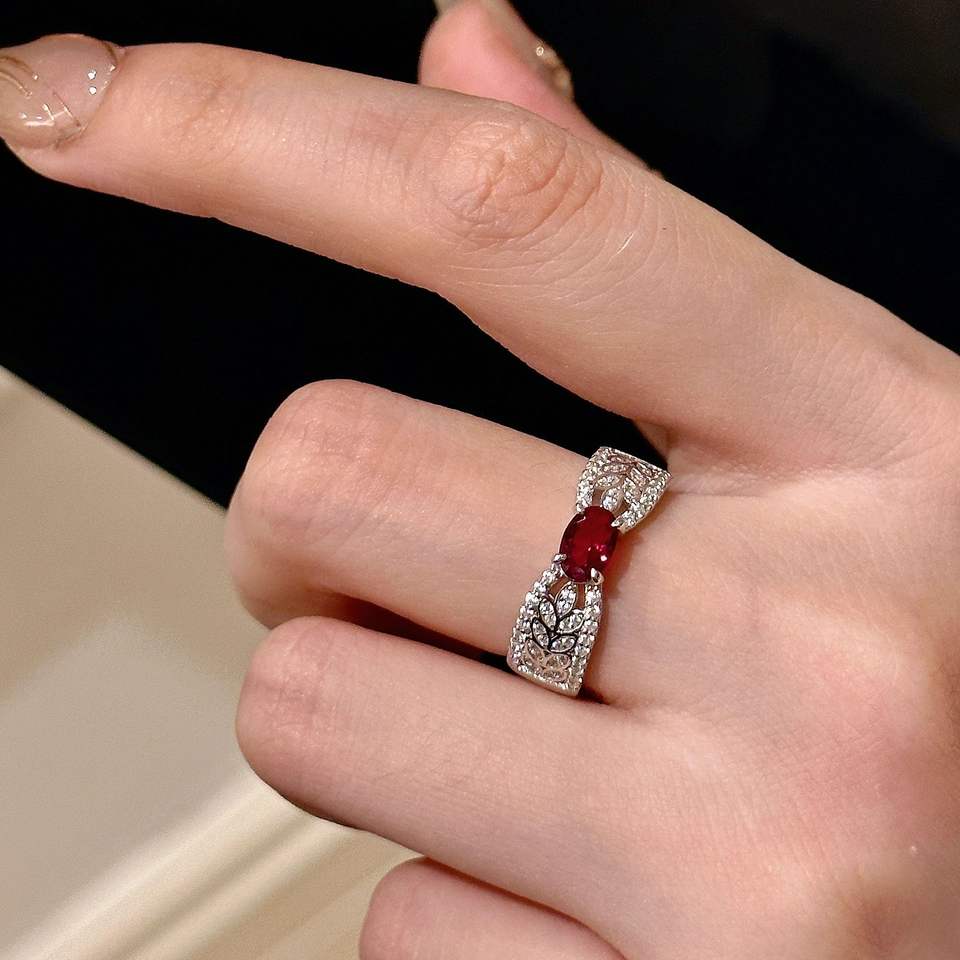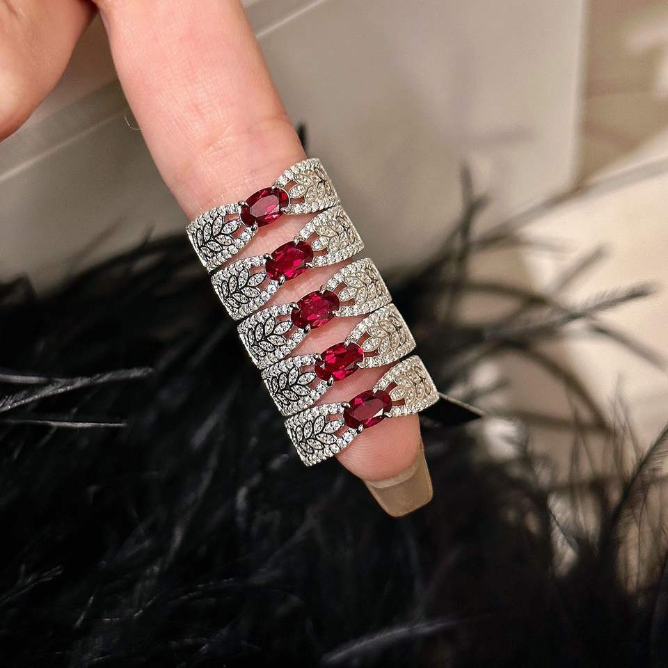 แหวนเงินแท้ S925 สไตล์วินเทจหรูหรา ประดับเพชรและทับทิมสีแดงเลือดนก ดีไซน์รูปรวงข้าวและโบว์ แหวนแฟชั่น