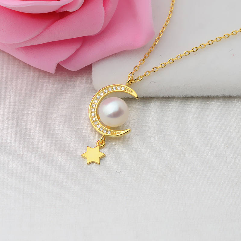 S925 Silver Star Moon Pendant with 8-9 Pearl Necklace Set Women's DIY Jewelry Accessories Inlaid 388
