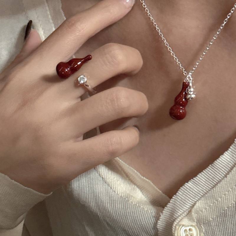 S925แหวนน้ำเต้าเงินแท้สีแดงแหวนทรงน้ำเต้าสไตล์เรโทรแบบ in เรียบง่ายชุดเครื่องประดับแฟชั่นดีไซน์เฉพาะรุ่นเกาหลี
