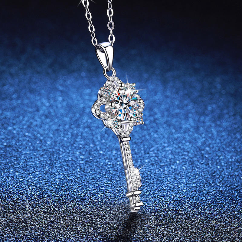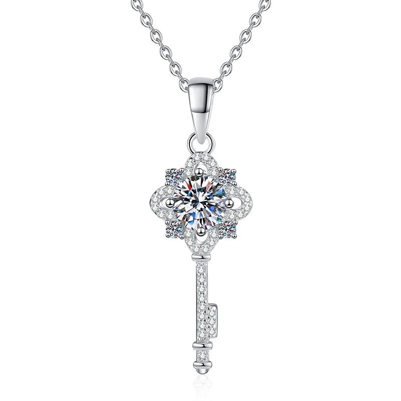สร้อยคอชุบเงิน S925จี้เพชรโมอิสโคไนต์รูปกุญแจรูปใบโคลเวอร์สี่แฉกห่วงโซ่เกลียว1กะรัตสำหรับบุคคลที่สามที่ได้รับการรับรองสำหรับผู้หญิง