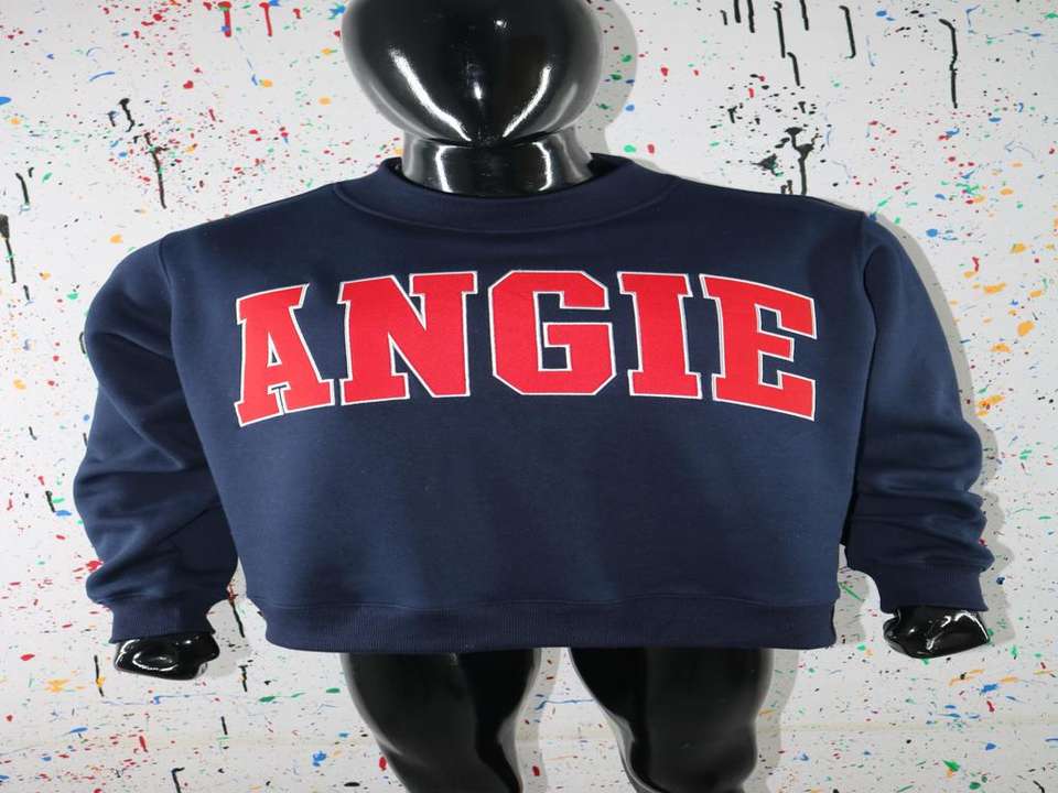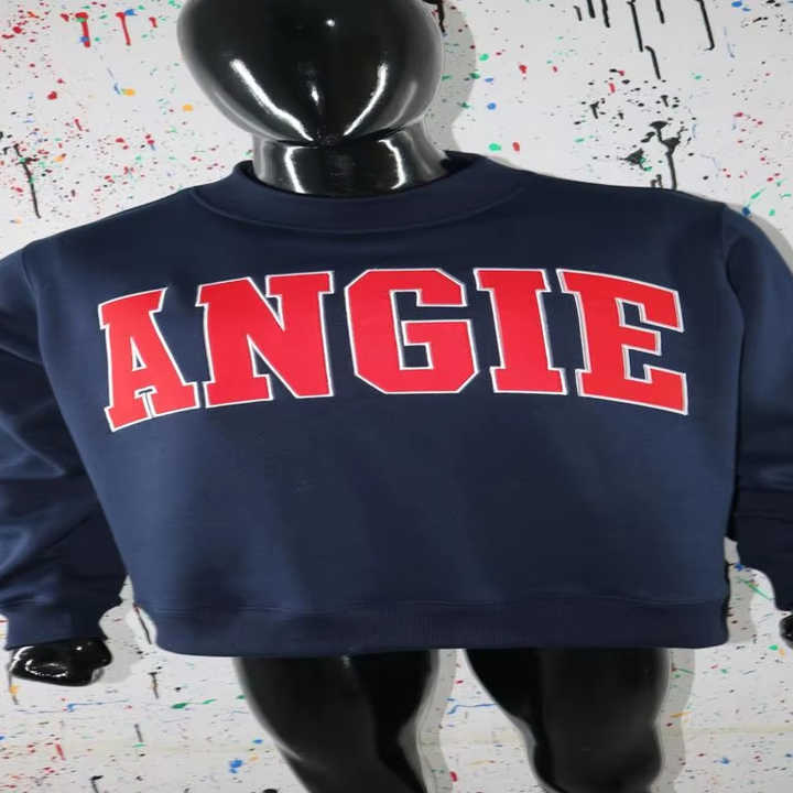 Angie เสื้อสเวตเตอร์คอปกว้างสีฟ้าผ้าปะติดสีแดง100% เสื้อกีฬาแนว clush