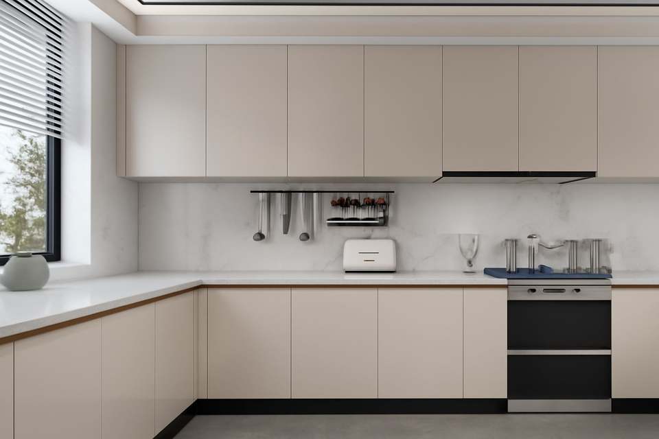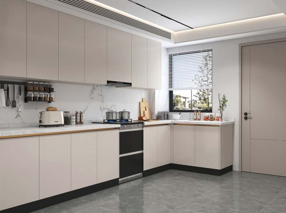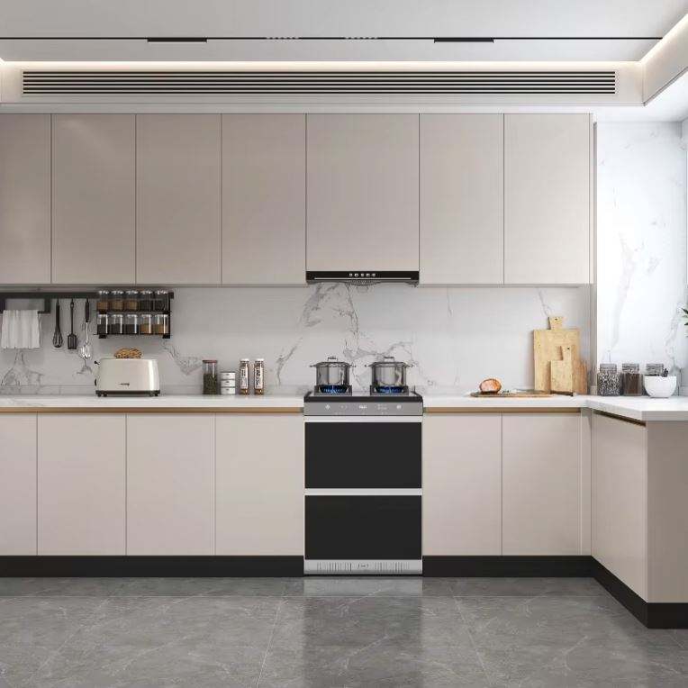 ตู้ครัวโมเดิร์นสีเบจ SANTOPOVA พร้อมแผ่นกันเปื้อนหินอ่อนและเตาอบคู่ในตัว