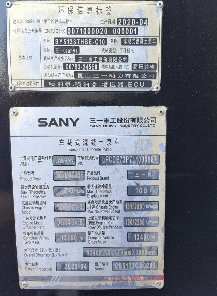 รถผสมคอนกรีต SANY 2020 รุ่น SY5133THBE-C10 มือสอง เครื่องยนต์ดีเซลมาตรฐานระดับ 5 พร้อมปั๊มคอนกรีต ความเร็ว 100 เมตร/ชั่วโมง