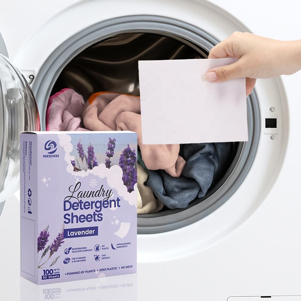 แผ่นซักผ้าซานหยวน แบบใช้แล้วทิ้ง เป็นมิตรกับสิ่งแวดล้อม ปราศจากสารก่อภูมิแพ้ ปลอดสารพิษ กลิ่นลาเวนเดอร์ ให้ผ้าเนียนนุ่ม