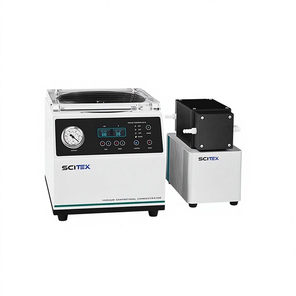 เครื่องแยกสารแบบแรงเหวี่ยงสุญญากาศ SCITEK 1800 รอบต่อนาที พร้อมฟังก์ชันเริ่ม/หยุดด้วยปุ่มเดียว วัสดุ PTFE ทนการกัดกร่อน สำหรับห้องปฏิบัติการ