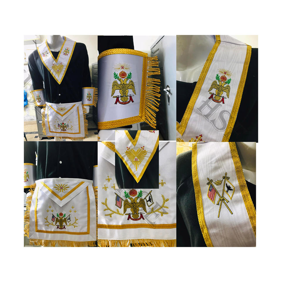 สก็อตพระราชพิธี33RD องศาผ้ากันเปื้อนที่มี CUFFS และปลอกคอทองเย็บปักถักร้อยลงปีก