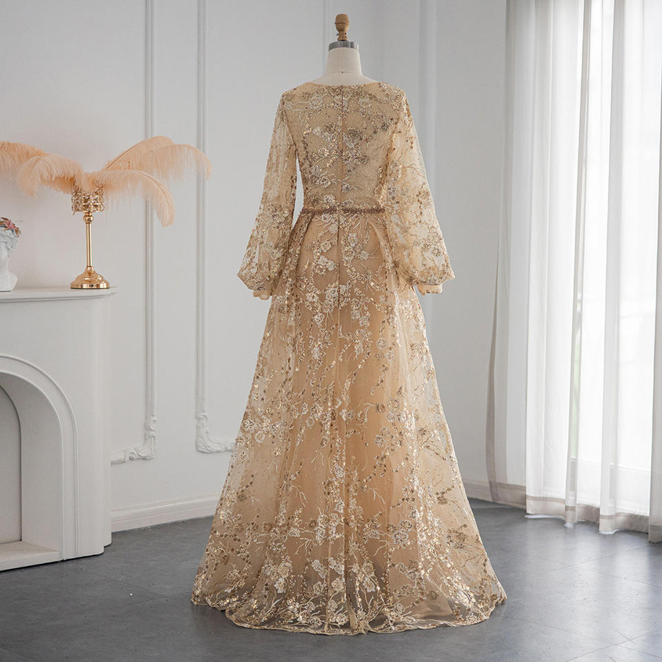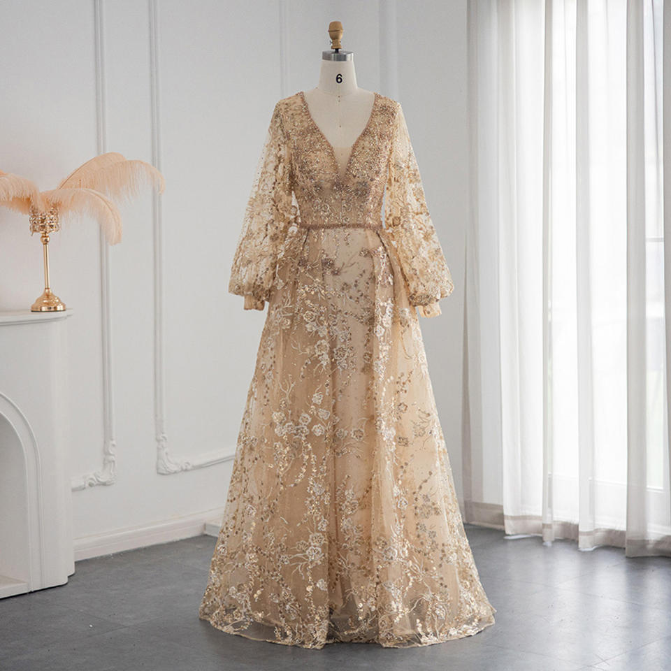 ชุดราตรีทรงเอไลน์ยาวกรอมพื้น รุ่น SCZ201 คอวี แขนปกติ ประดับคริสตัล ขนนก ลายดอกไม้ ไข่มุก จีบระบาย เหมาะสำหรับงานปาร์ตี้ งานพรอม