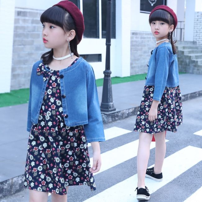 ชุดเสื้อผ้าเด็กผู้หญิงฤดูใบไม้ผลิ SE3199 ชุดเดรสผ้าฝ้ายลายดอกไม้ เสื้อแจ็คเก็ตยีนส์ ขายส่งเสื้อผ้าเด็ก ชุดเดรส
