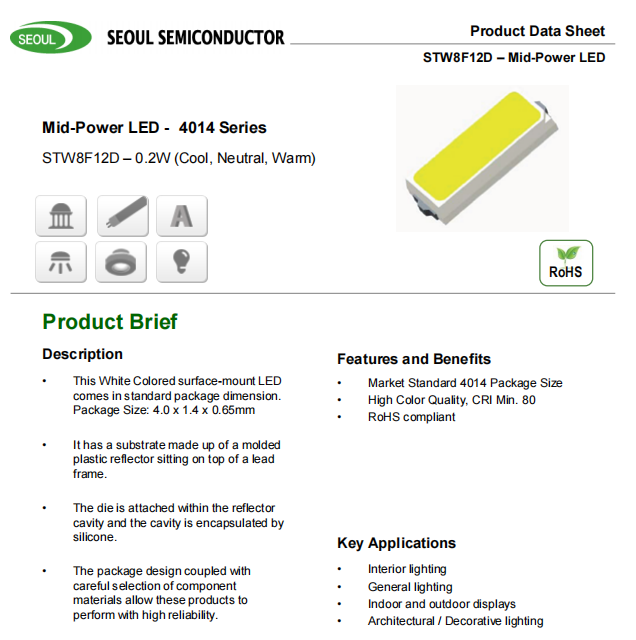 Seouls ซีรีย์ไฟ LED ระดับกลาง4014 STW8F12D 0.2W 3V 60mA 30LM เย็นเป็นกลาง2600K-7000K ชิป LED