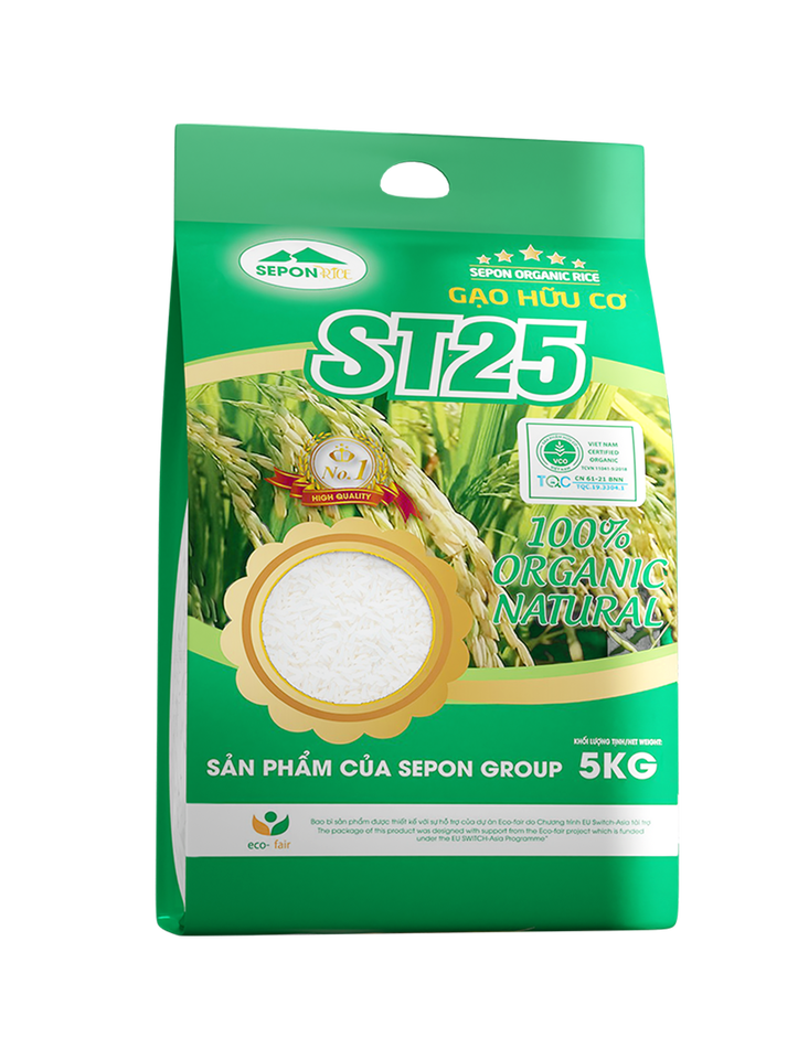 ข้าวขาวออร์แกนิค 100% ยี่ห้อ SEPON บรรจุถุง 5 กก. เมล็ดยาว เนื้อแข็ง ได้รับการรับรองมาตรฐาน ISO ข้าวหัก 5% ความชื้น 3% ผลิตจากเวียดนาม