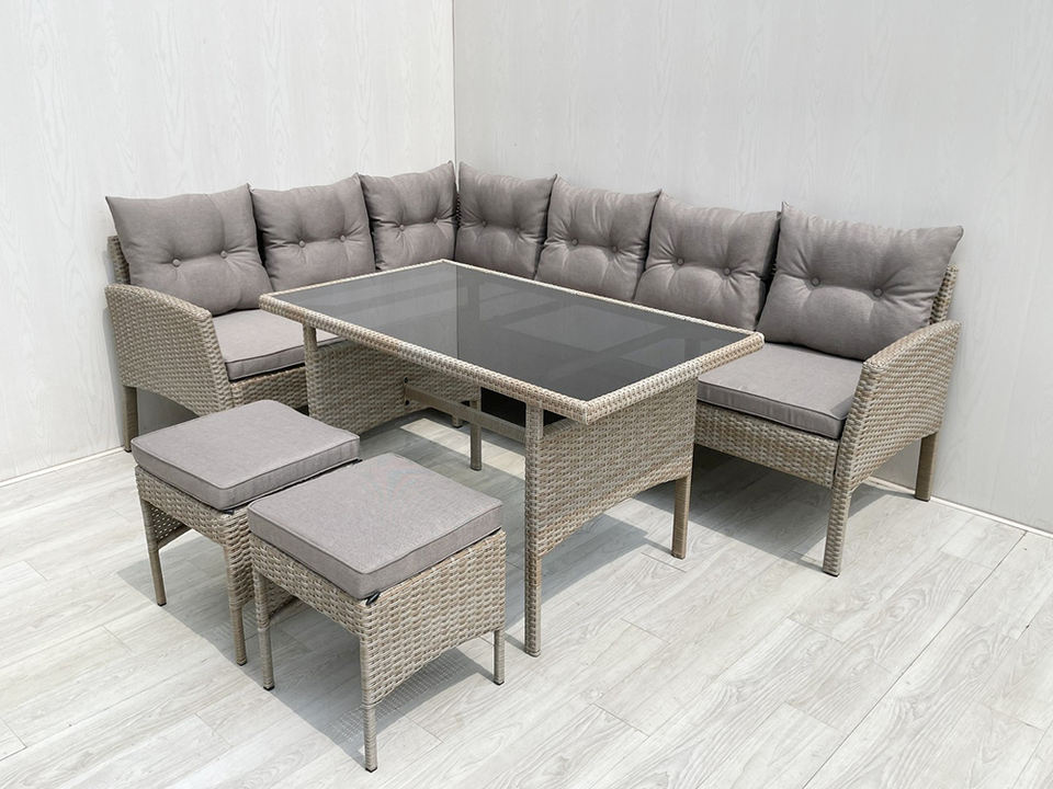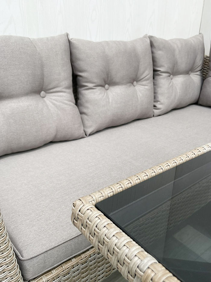 ชุดโซฟาสวนหวายเหล็กกระจกนิรภัยทันสมัย SF00093 พร้อมเบาะโพลีเอสเตอร์สำหรับวิลล่ากลางแจ้ง ผลิตจากโรงงานโดยตรงในเวียดนาม