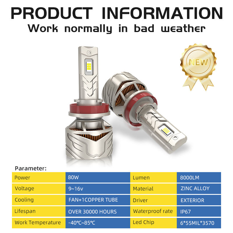 Sfida ไฟหน้า LED พลังงานสูง K10 80W 6000K พร้อมกล่องโลโก้ที่กำหนดเองรูปแบบลำแสงเลเซอร์8000ลูเมนเพื่อความสว่างสูงสุด