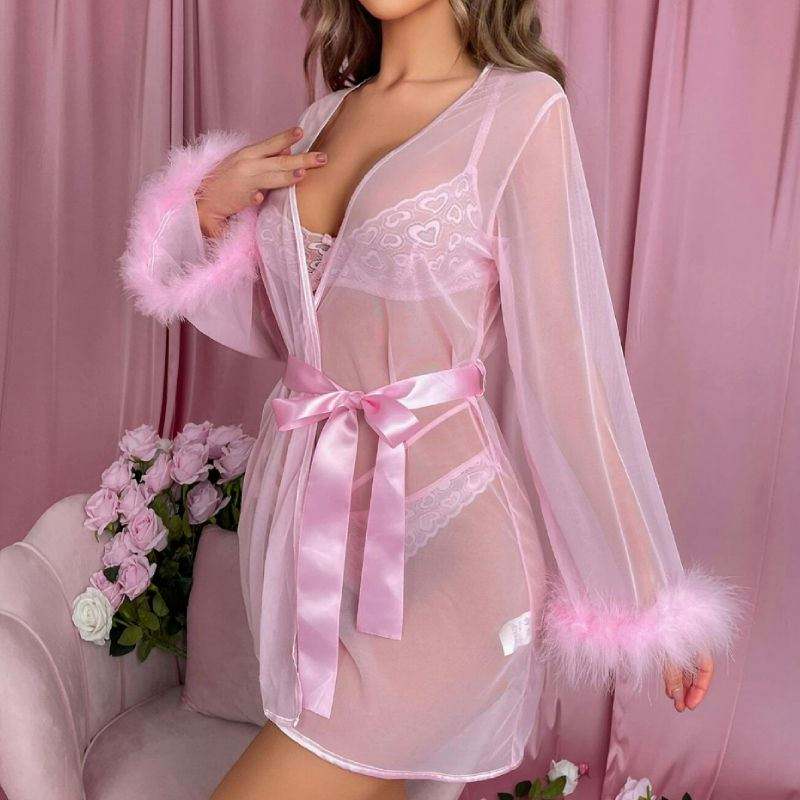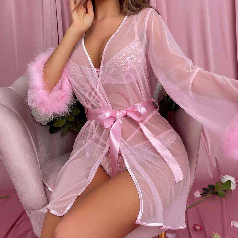 ชุดชั้นในเซ็กซี่ SFY3348 ผ้าลูกไม้ซีทรูประดับโบว์ขนนก ระบายอากาศได้ดี ซักมือได้ ชุดเซ็ต 1 ชิ้น ชุดคลุมสำหรับผู้หญิง