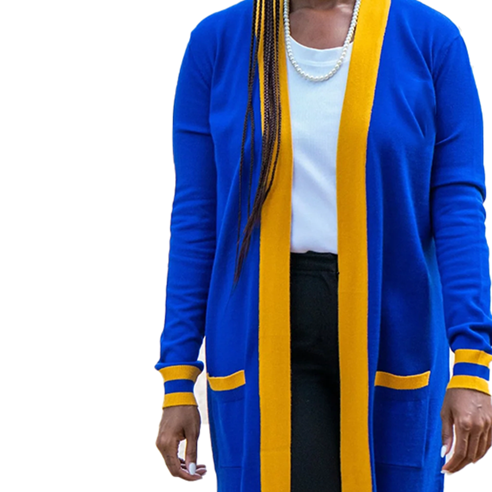 เสื้อคลุมคาร์ดิแกนไหมพรมขนสัตว์/แคชเมียร์สีน้ำเงินรอยัลบลูและสีทอง สำหรับฤดูหนาว พร้อมกระเป๋าและปลายแขนเสื้อลายทาง ดีไซน์แบบเปิดด้านหน้าทรงยาว สไตล์ราชวงศ์