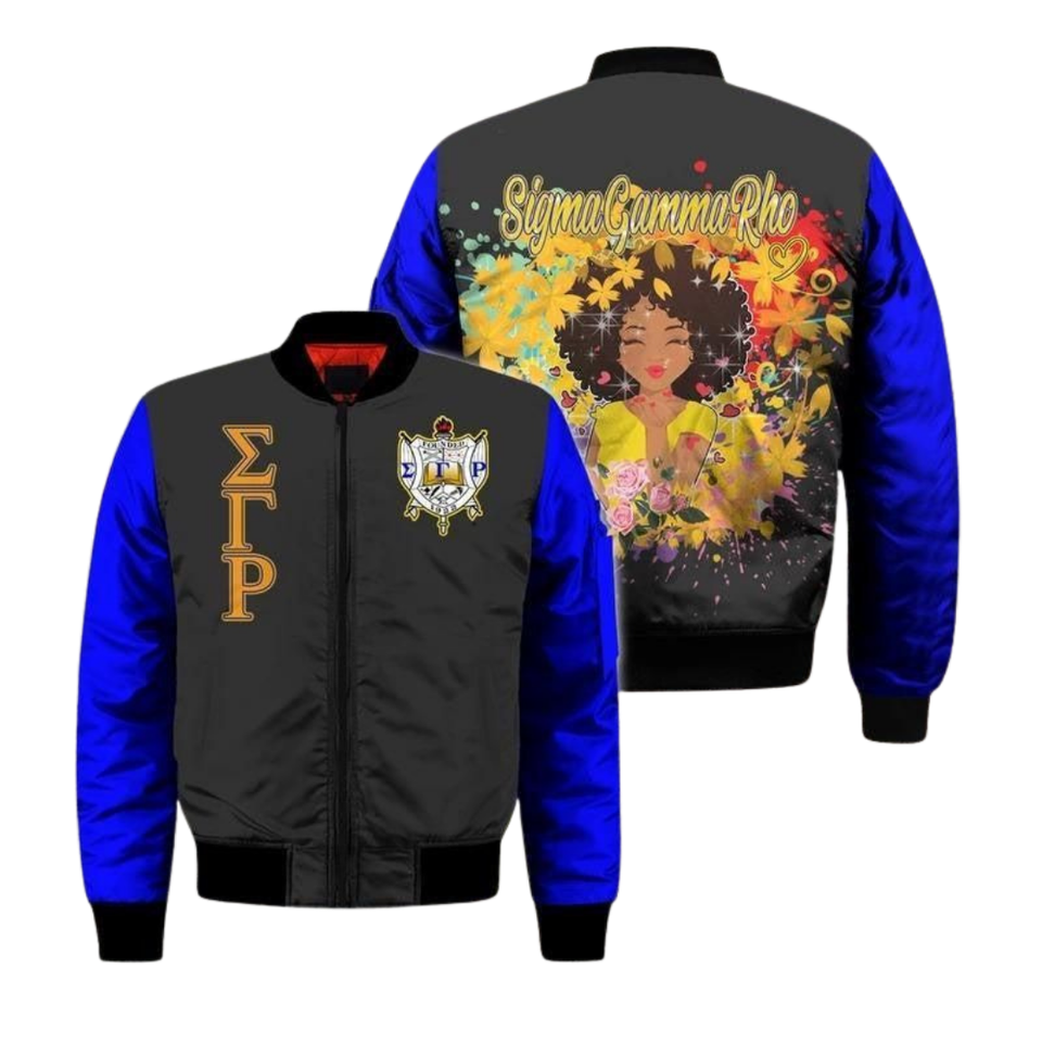 Sgrho Sigma เสื้อแจ็กเก็ตซาติน1922แกมมา Rho สีน้ำเงินทองปักลายบอมเบอร์เสื้อนอกสตรี