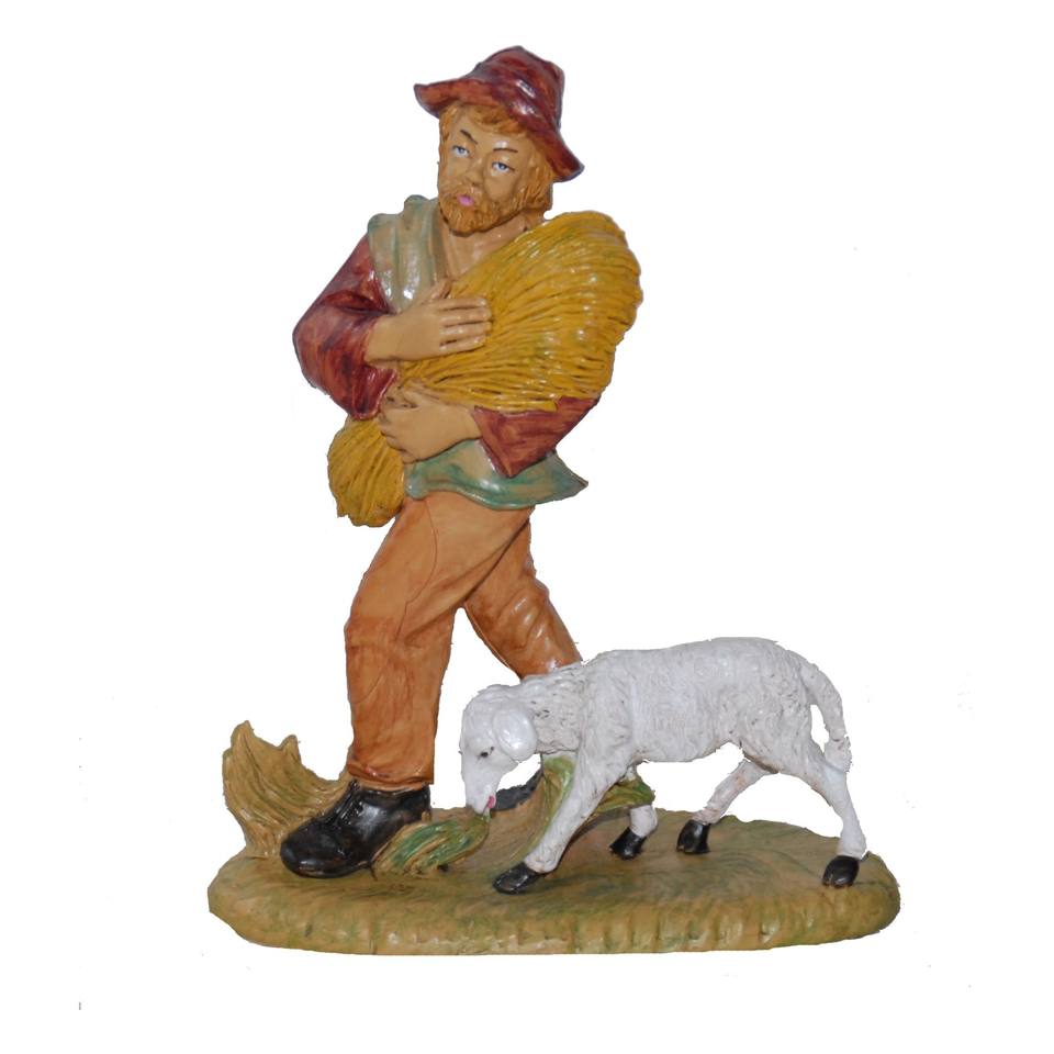 รูปปั้นคนเลี้ยงแกะพร้อมหญ้าแห้งและแกะ รุ่น LUX ทำจาก PVC ลายไม้ สูง 20 ซม.