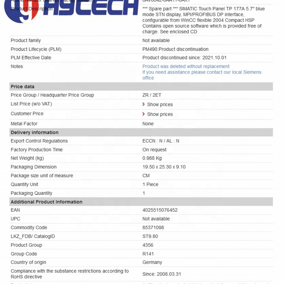 ชื่อสินค้า:แผงสัมผัส SIMATIC TP177A
