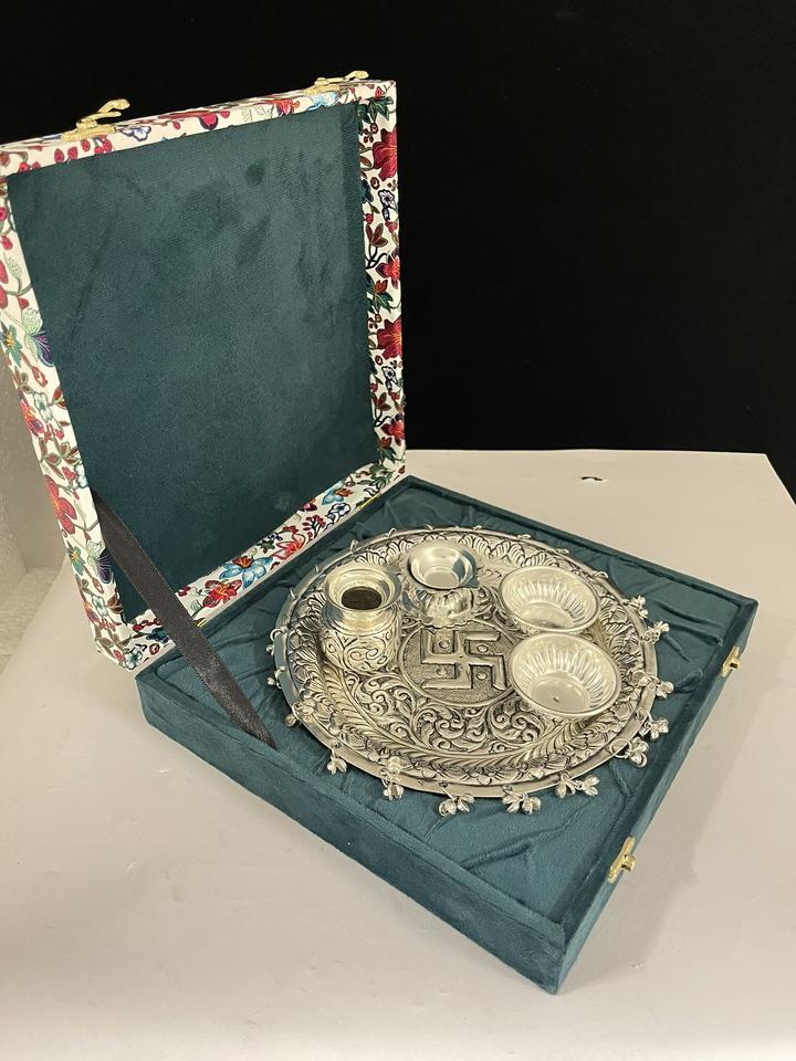 ชุดถาดพิธีกรรมชุบเงินพร้อมกล่องของขวัญพิมพ์ลายสวยงาม