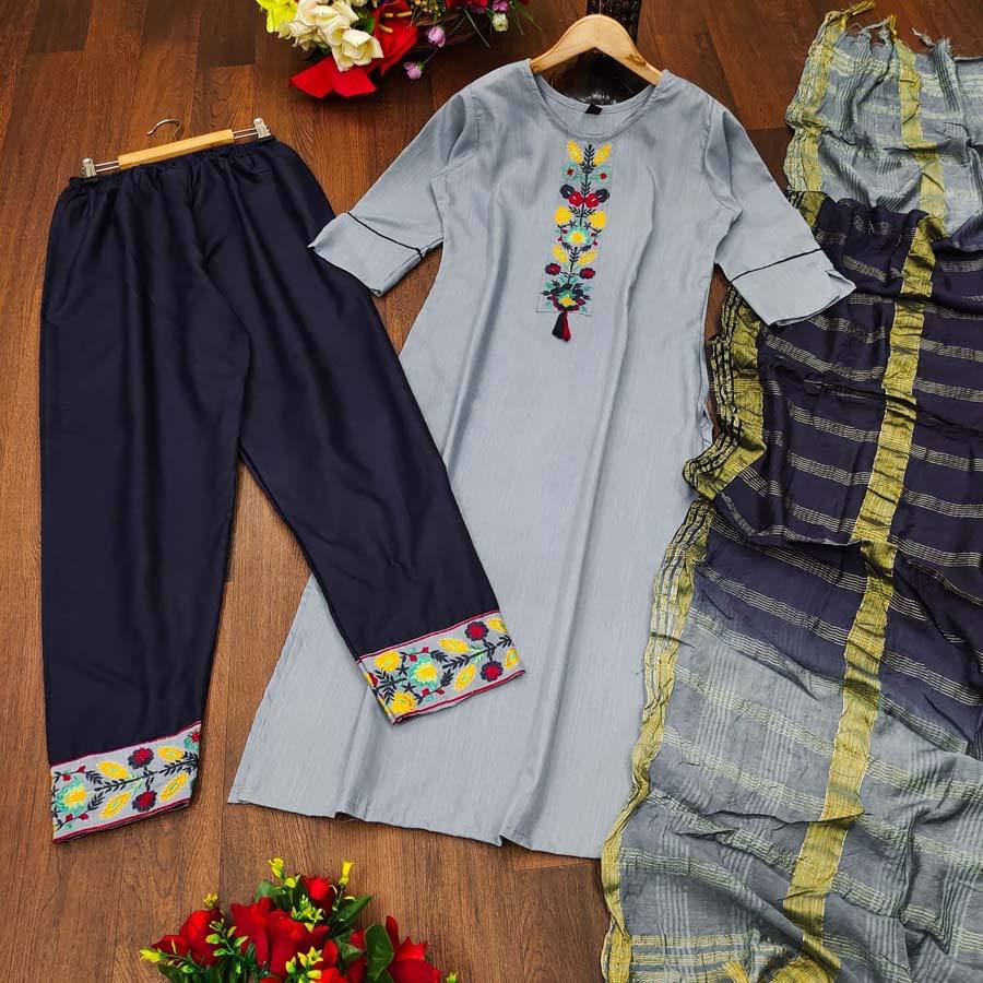 SIMPLE VISCOSE DESIGNER REGULAR FIT TOP PANT SET WITH DUPATTA READY to WEAR GREY