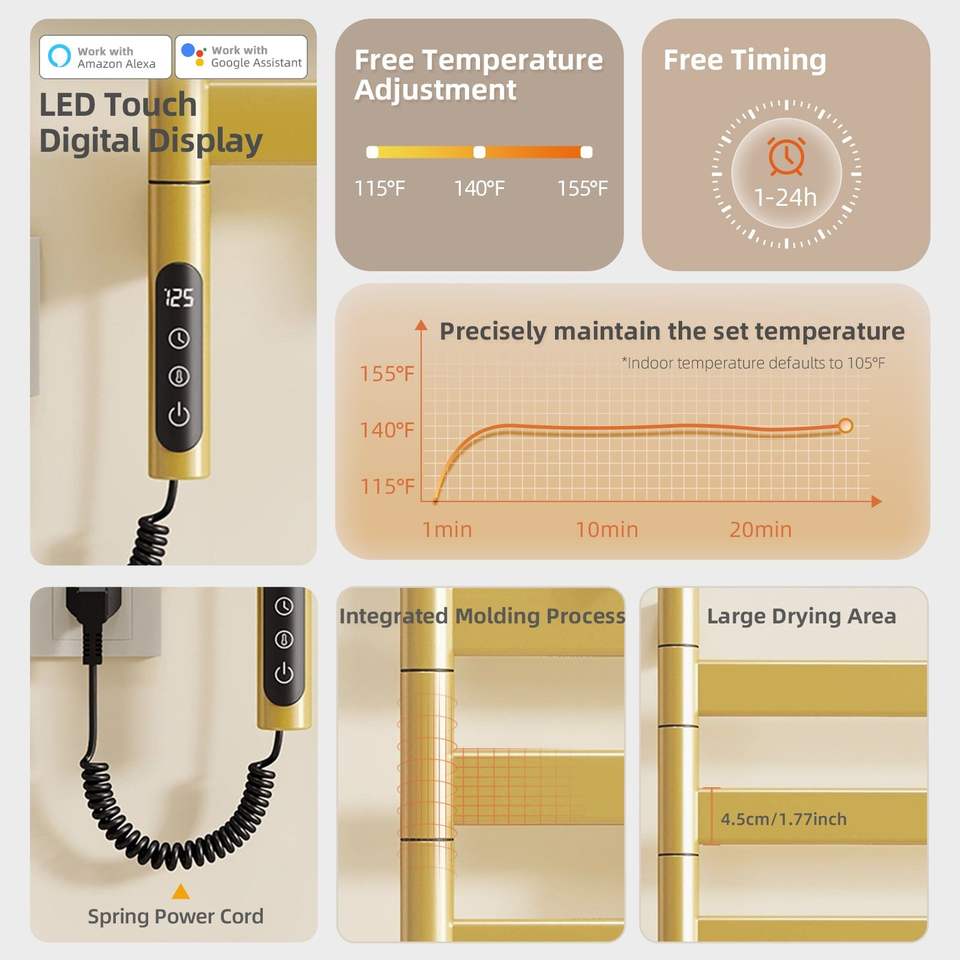 ราวแขวนผ้าเช็ดตัวไฟฟ้าติดผนัง SIOYIE แบบหมุนได้และให้ความร้อน พร้อมตัวตั้งเวลาอัจฉริยะและคุณสมบัติคาร์บอนต่ำ สำหรับใช้ในห้องน้ำ