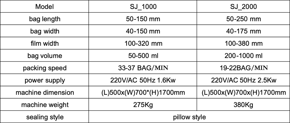 เครื่องบรรจุของเหลวอัตโนมัติ SJ-1000 แบบ PLC ไฟฟ้า ขนาด 50-500 มล. บรรจุได้ 37 ซอง/นาที พร้อมระบบชั่งน้ำหนัก บรรจุภัณฑ์ฟิล์ม/ฟอยล์ ปิดผนึกกาวกระดาษ