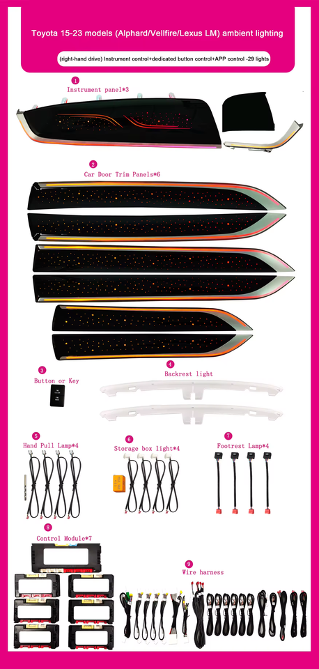 ไฟตกแต่งภายในรถยนต์ SJC 64 สี คริสตัลไดนามิก สำหรับรถยนต์โตโยต้า อัลฟาร์ด/เวลไฟร์ ปี 2015-2023 พวงมาลัยขวา/ซ้าย อุปกรณ์ตกแต่งภายในรถยนต์