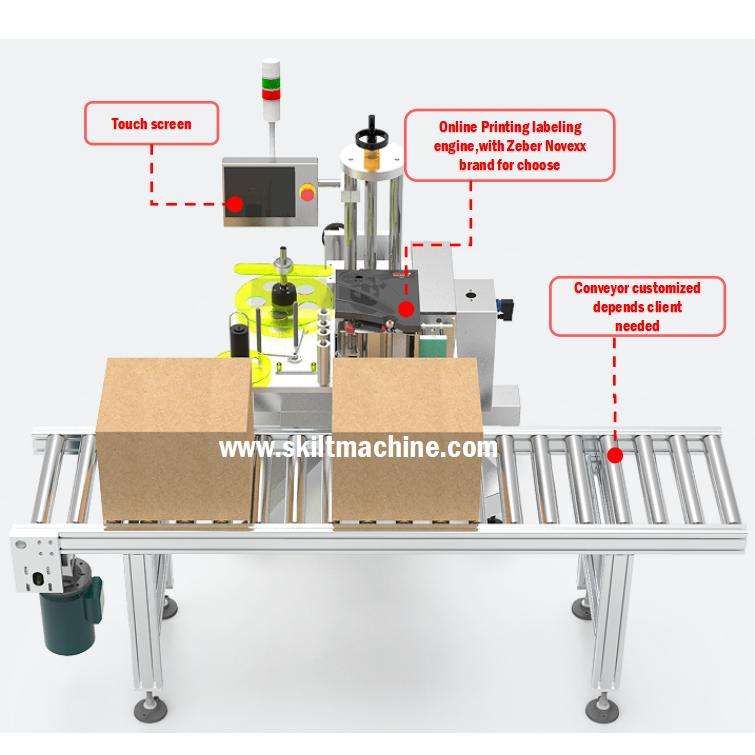 เครื่องติดฉลากอัตโนมัติแบบเต็มรูปแบบ SKILT สำหรับติดฉลากบนด้านบนและด้านข้างกล่อง พร้อมระบบพิมพ์ฉลากออนไลน์ ผู้ผลิตเครื่องติดฉลาก