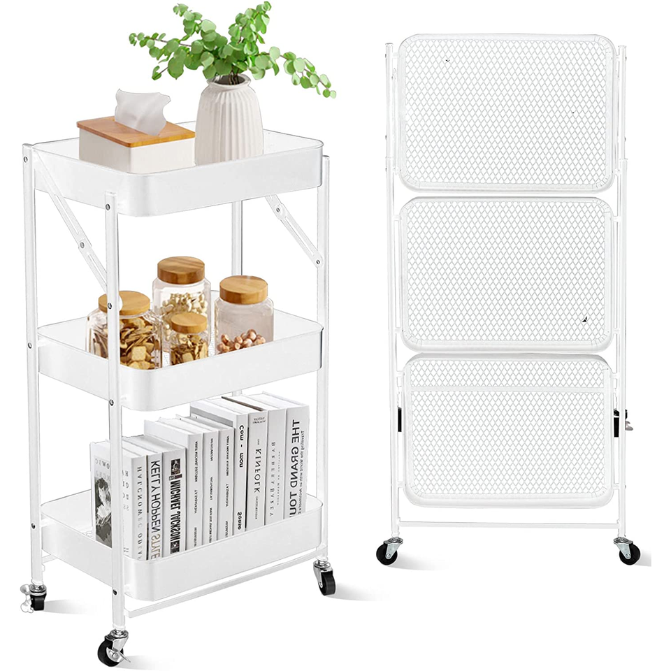 SKY-TOUCH 3-Tier Foldable Metal Rolling Utility Cart Organizer 46x30x76cm Multipurpose Organizer Trolley Casters for Bedroom