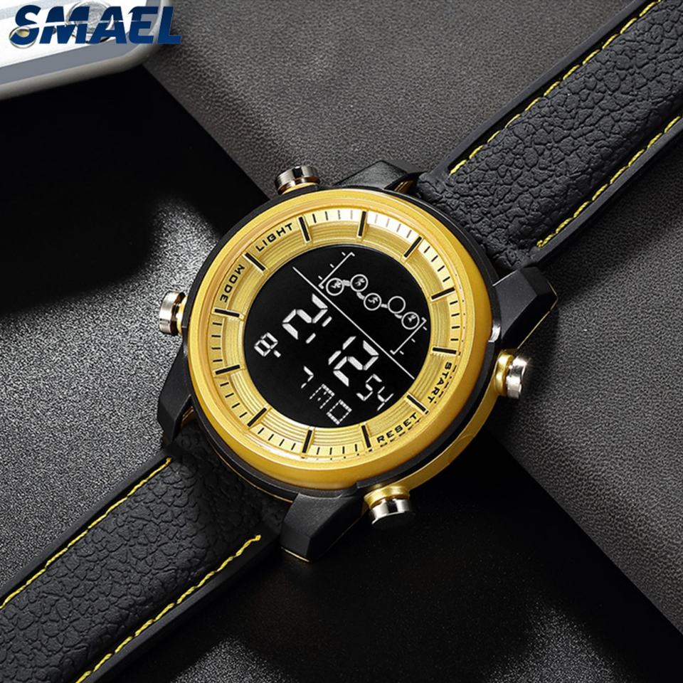 Smael นาฬิกาข้อมือแนวสปอร์ต1556มีไฟเตือนแบบดิจิตอลสายหนัง PU ไฟด้านหลัง