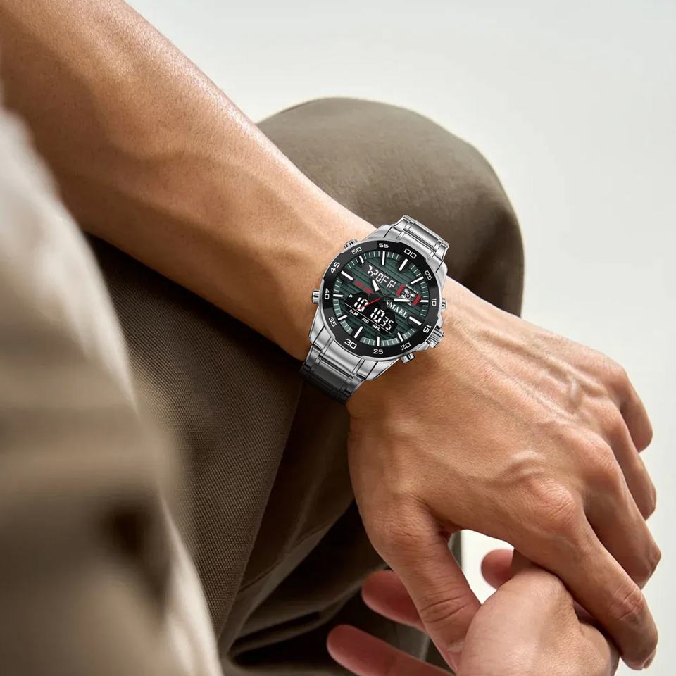 SMAEL 6076 นาฬิกาโครโนกราฟแบบอะนาล็อก-ดิจิตอลสำหรับธุรกิจ กันน้ำ พร้อมไฟเรืองแสง ตัวเรือน/หน้าปัดโลหะผสม และสายสแตนเลส