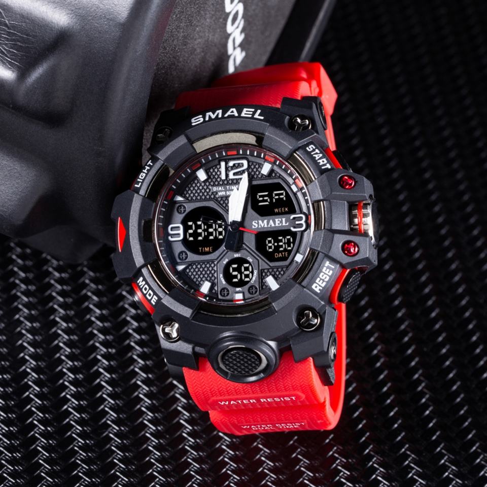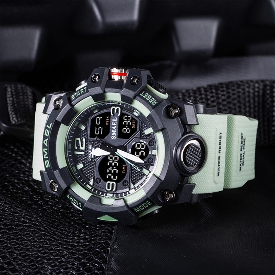 นาฬิกาข้อมือดิจิตอล SMAEL 8008 ระบบสองเวลา สำหรับผู้ชาย แฟชั่นกีฬา กันน้ำ โครโนกราฟ อิเล็กทรอนิกส์ พร้อมฟังก์ชั่นตั้งเวลาปลุกและวันที่อัตโนมัติ