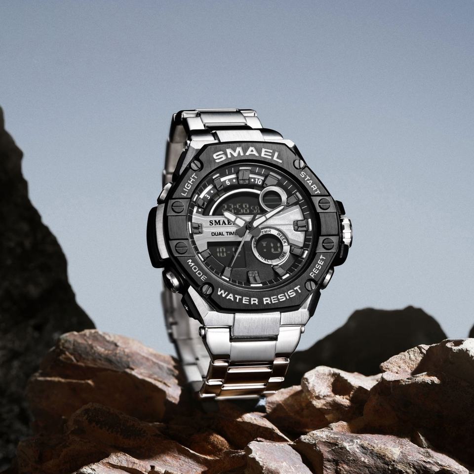 นาฬิกา SMAEL 8090 แฟชั่นอิเล็กทรอนิกส์ อนาล็อก ดิจิตอล ตัวเรือนโลหะผสม ควอตซ์ กันน้ำ นาฬิกาสปอร์ตโครโนกราฟ