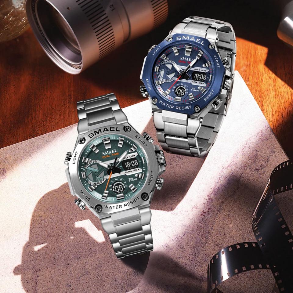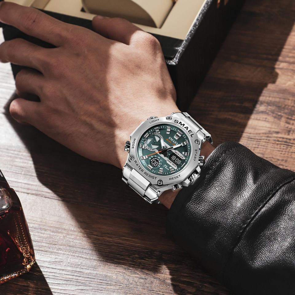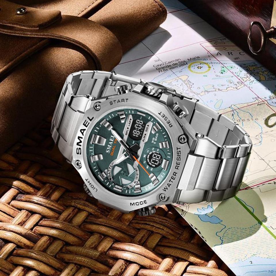 นาฬิกา SMAEL 8097 รุ่นใหม่ หรูหรา ดีไซน์อนาล็อก-ดิจิตอล โครโนกราฟ กันน้ำ เรืองแสง ตัวเรือน/หน้าปัดโลหะผสม สายสแตนเลส สไตล์นักดำน้ำ พร้อมฟังก์ชั่นปลุก