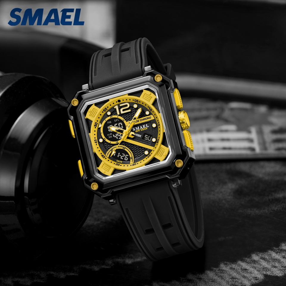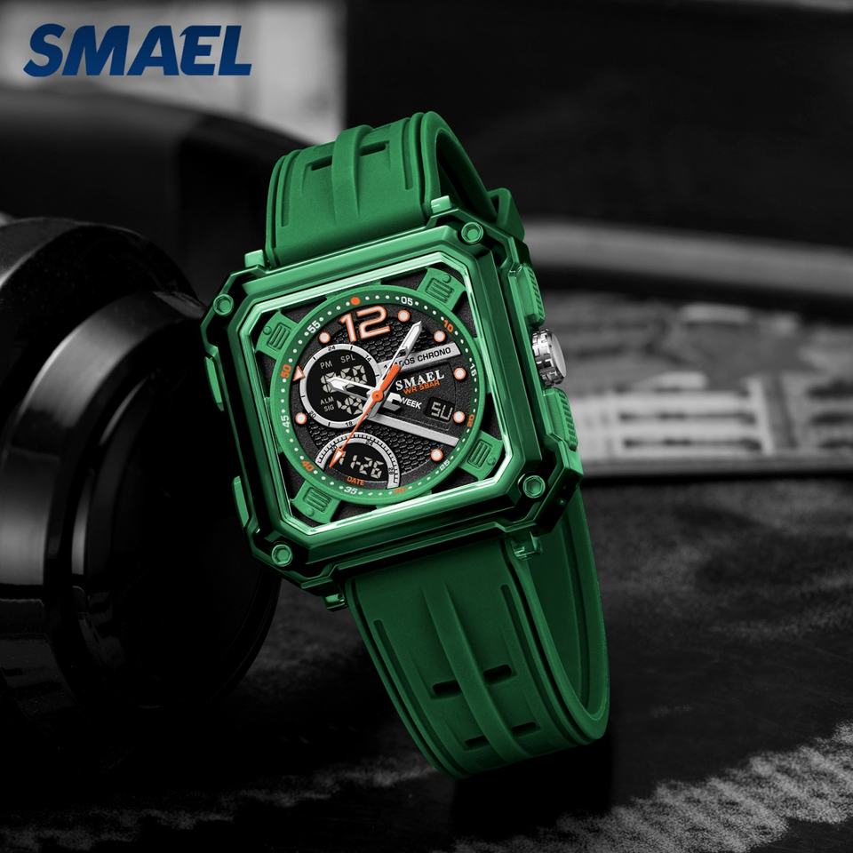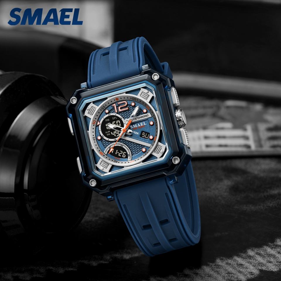 นาฬิกาข้อมือดิจิตอล SMAEL 8121 รุ่นสั่งทำพิเศษ ดีไซน์สปอร์ต ตัวเรือนพลาสติกทรงเหลี่ยม สำหรับผู้ชาย พร้อมฟังก์ชั่นจับเวลา โครโนกราฟ แสดงข้างขึ้นข้างแรม ตั้งปลุก กันน้ำได้ 50 บาร์