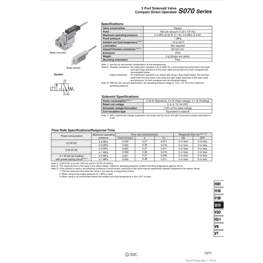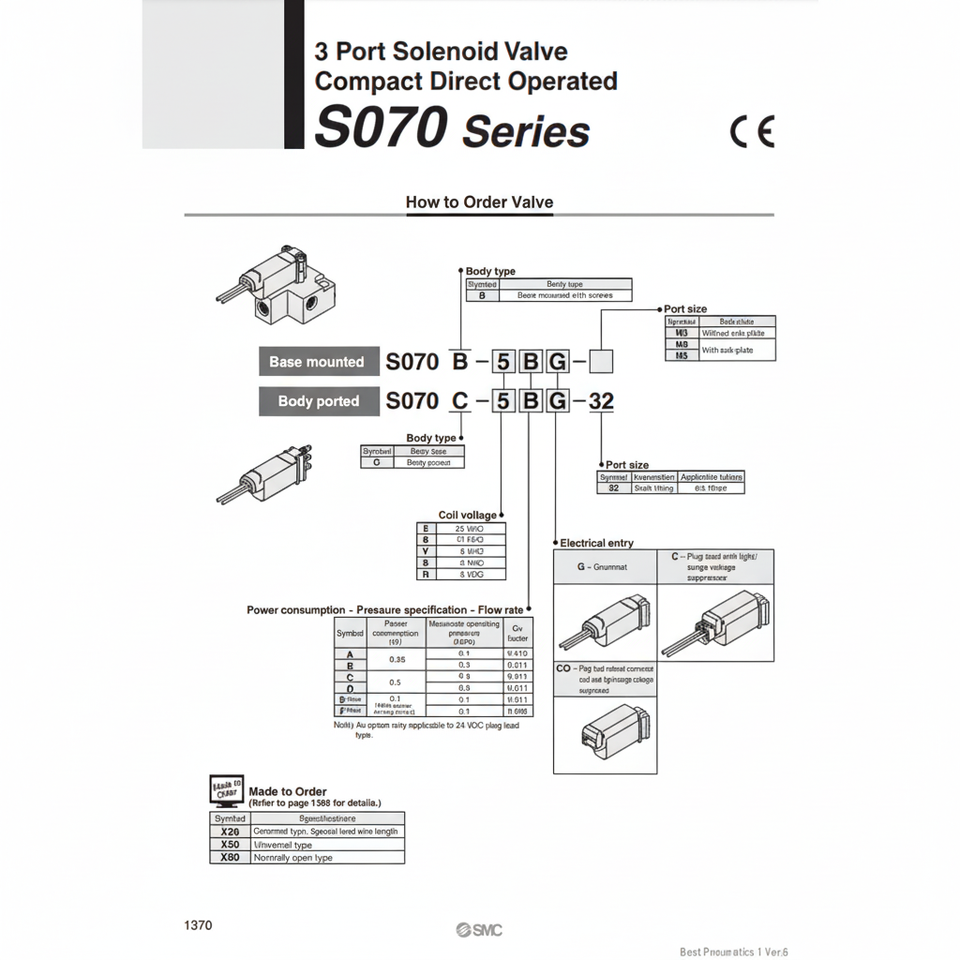 วาล์วโซลินอยด์นิวเมติก SMC วาล์วควบคุม S070B-5DC-M5