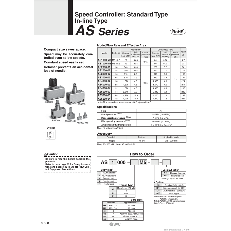 อุปกรณ์ควบคุมความเร็วลม AS3000-02-L ชิ้นส่วนนิวเมติก SMC
