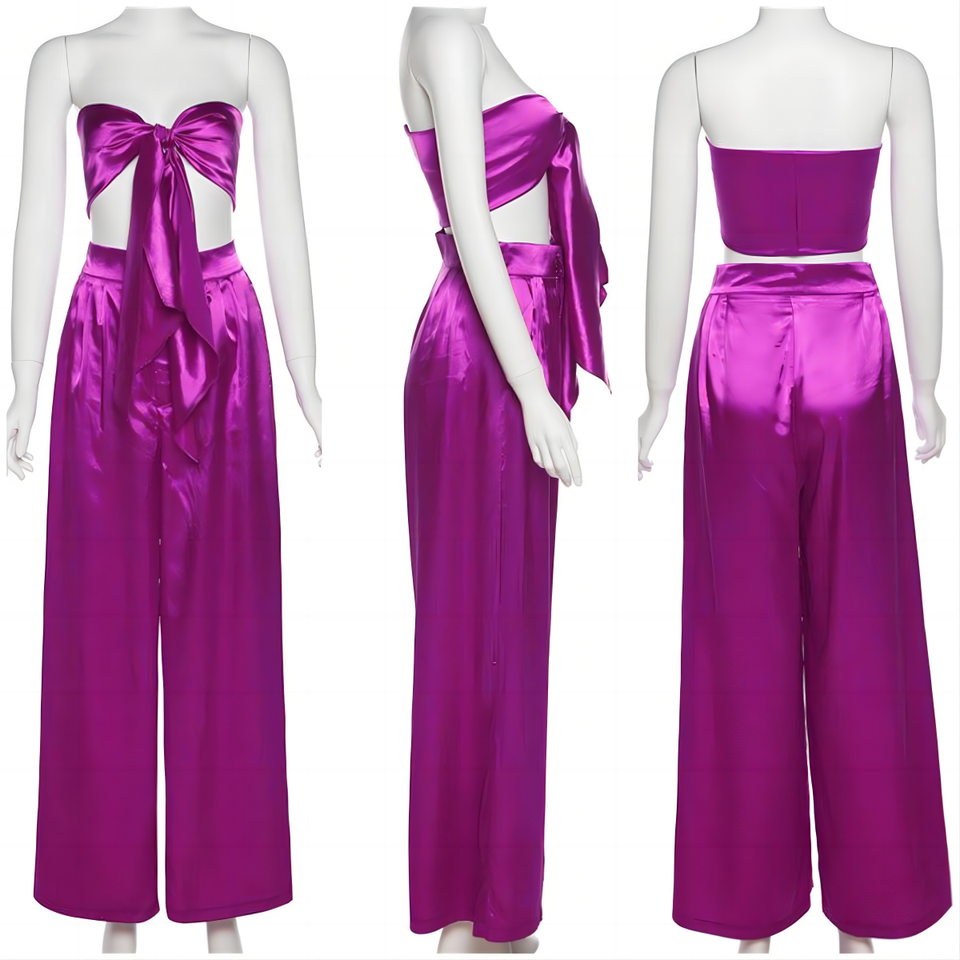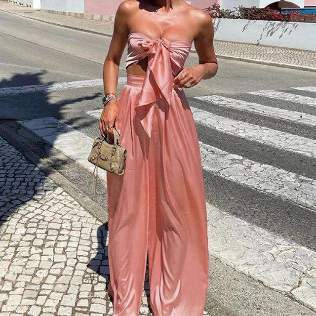 SML ฤดูร้อนใหม่ผู้หญิงสั้นเปิดสะดือ Bra เอวสูงห่อสะโพกกางเกงขากว้างชุดลําลอง