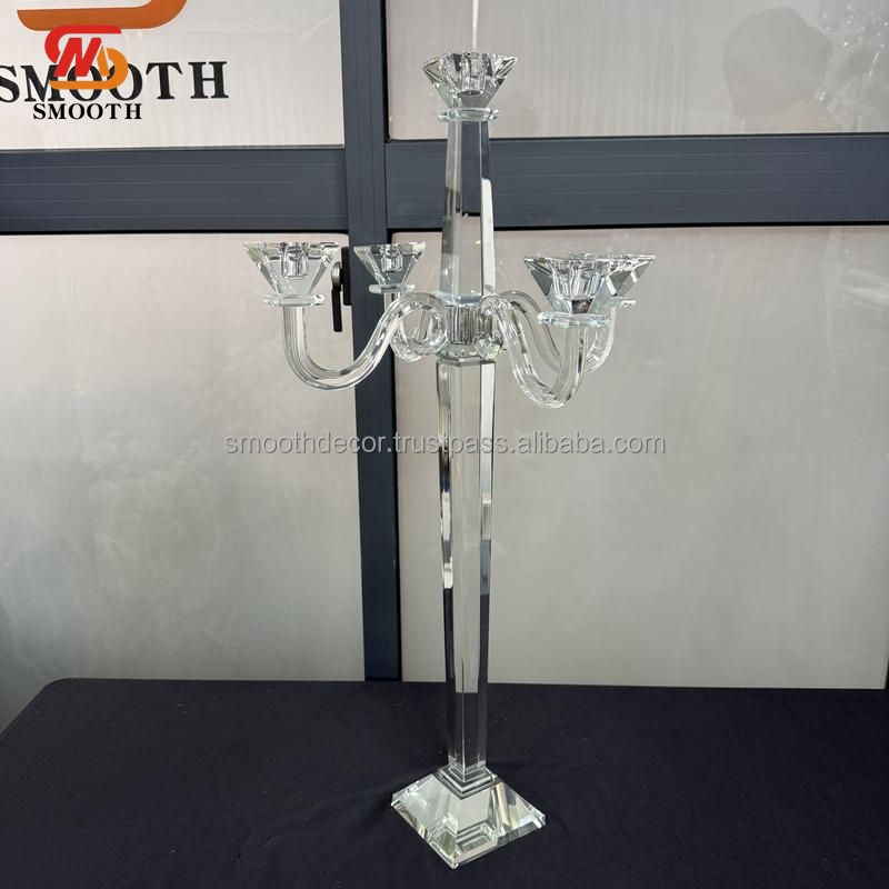 เชิงเทียนคริสตัล5แขนเรียบพร้อมถ้วยแก้วเฮอริเคนเชิงเทียนเชิงเทียนสำหรับงานแต่งงาน
