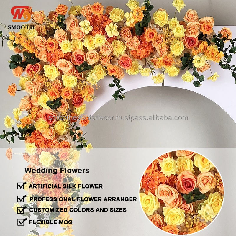 ดอกไม้ปลอมตกแต่งงานแต่งงานดอกไม้โค้งเรียบสีส้มสีเหลืองดอกไม้พื้นหลังแถวดอกไม้ตกแต่งดอกไม้