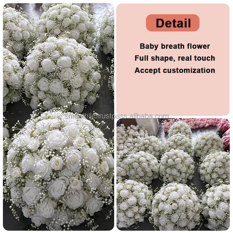 ลูกบอลดอกไม้งานแต่งงานแบบคลาสสิกเรียบลูกบอลดอกไม้ดอกกุหลาบสีขาวอมชมพูขนาด60ซม. สำหรับจัดงานตกแต่งตรงกลางโต๊ะ