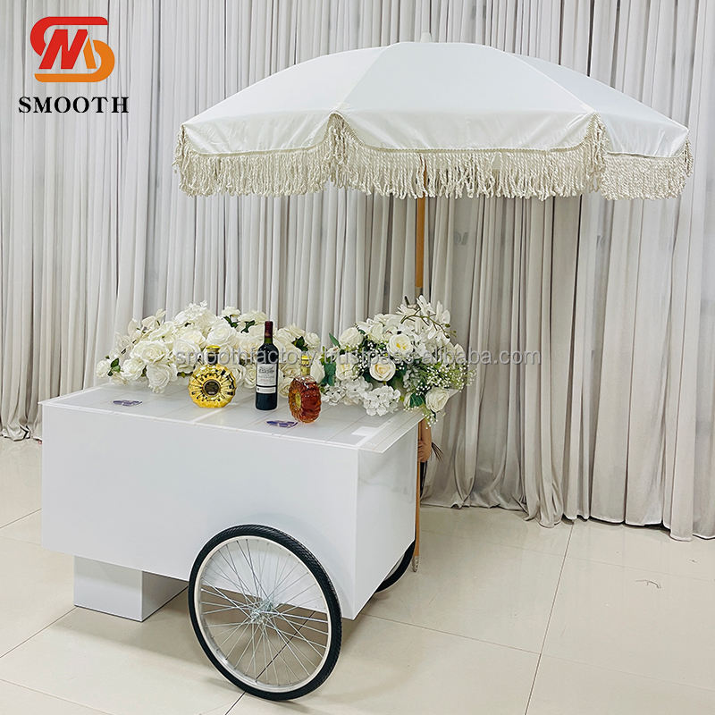 รถเข็นขนมโลหะสีขาวแบบปรับแต่งได้เรียบเนียนแท่นโชว์สำหรับงานแต่งงานของตกแต่งงานปาร์ตี้ที่แสดงเค้กขนมหวานอาหาร