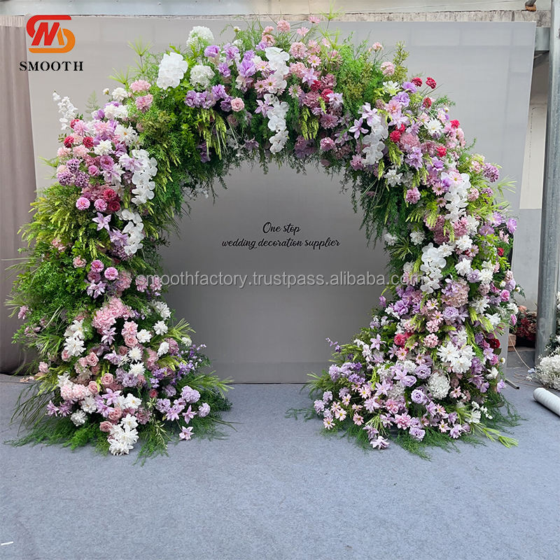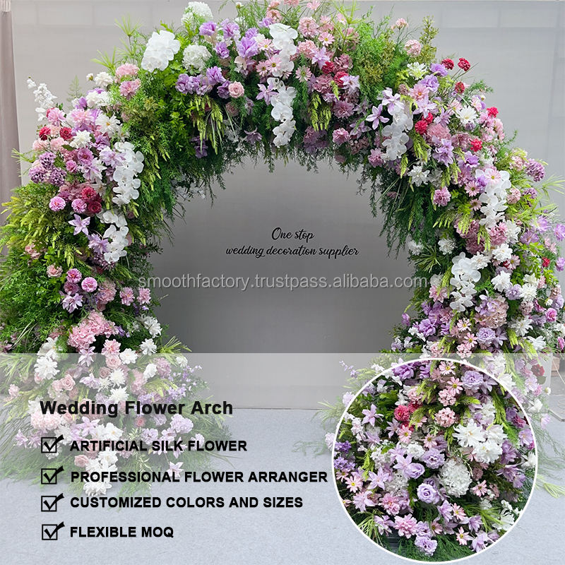 ซุ้มดอกไม้งานแต่งงานแบบโค้งหักสีเขียวสีชมพูดอกกุหลาบสีม่วงเรียบออกแบบได้ตามต้องการ