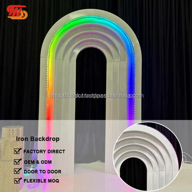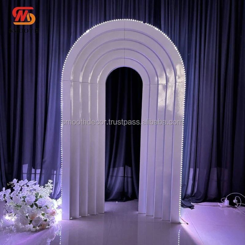 ฉากหลังเหล็กสำหรับงานแต่งงานแบบปรับแต่งได้อย่างเรียบฉากหลังรูปภาพโค้งผนังสีขาวสำหรับเหตุการณ์กระเพื่อมฉากหลังพร้อมไฟ LED